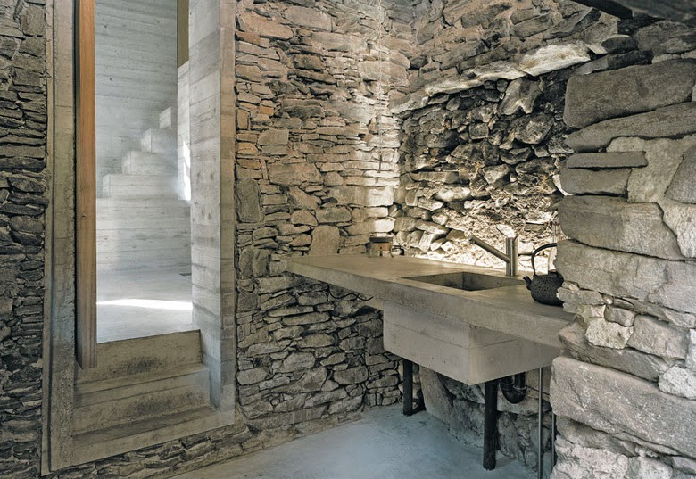 Kamenné základy a torzo dřevěného srubu bylo bezezbytku ponecháno, došlo k malému rozšíření stavby do strany a a sáhlo se k radikální přestavbě interiéru. Tady, třicet kilometrů od Locarna, by se stejně nějaké zásadní stavební změny v horách asi nehodily.