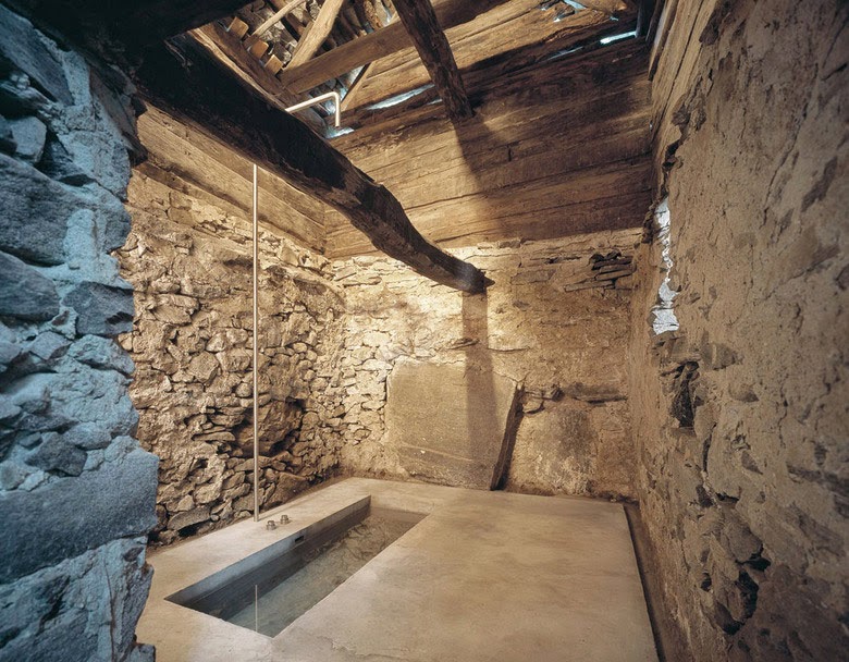 Vana se totiž nachází ve venkovní přístavbě, a takové koupání ve švýcarských Alpách asi nebude pro každého. „Při rekonstrukci jsme bojovali o zachování archaického vzhledu,“ říkají architekti. „Chtěli jsme zachovat charakter místa, bez ohledu na požadavek moderního bydlení. Atmosféra je to, co se počítá.“