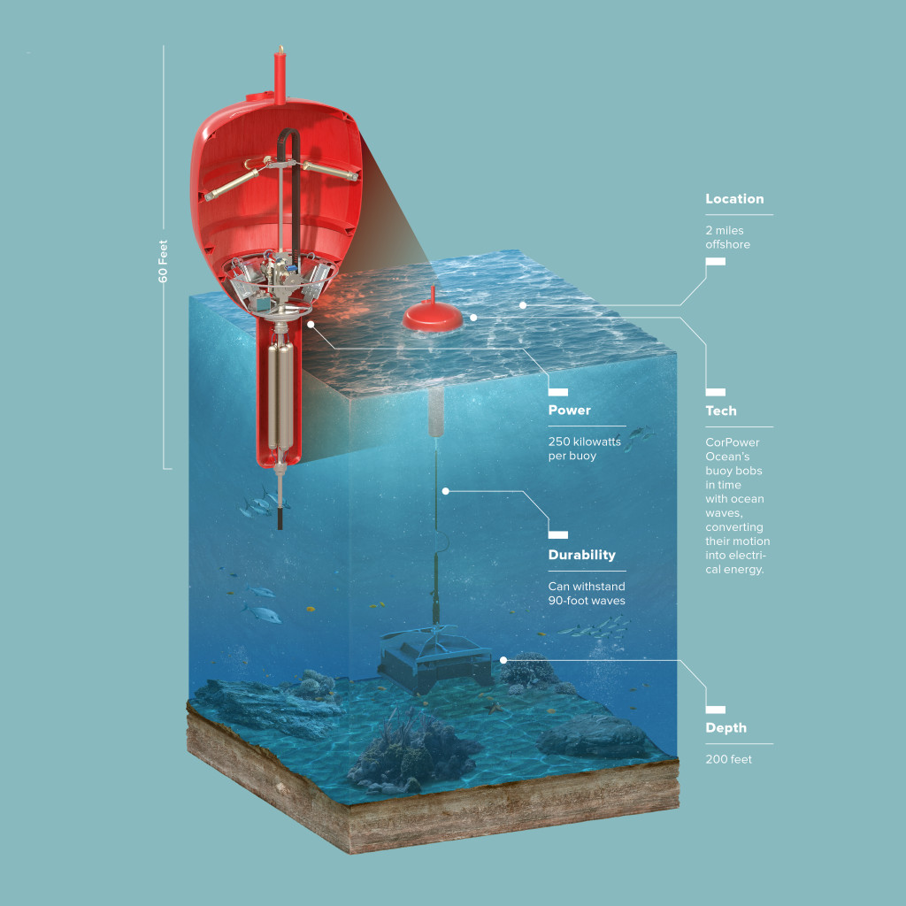 „S výkonem 250 kW dokáže jedna bójka zásobovat až 200 domácností čistou elektřinou.“ Zdroj: CorPowerOcean